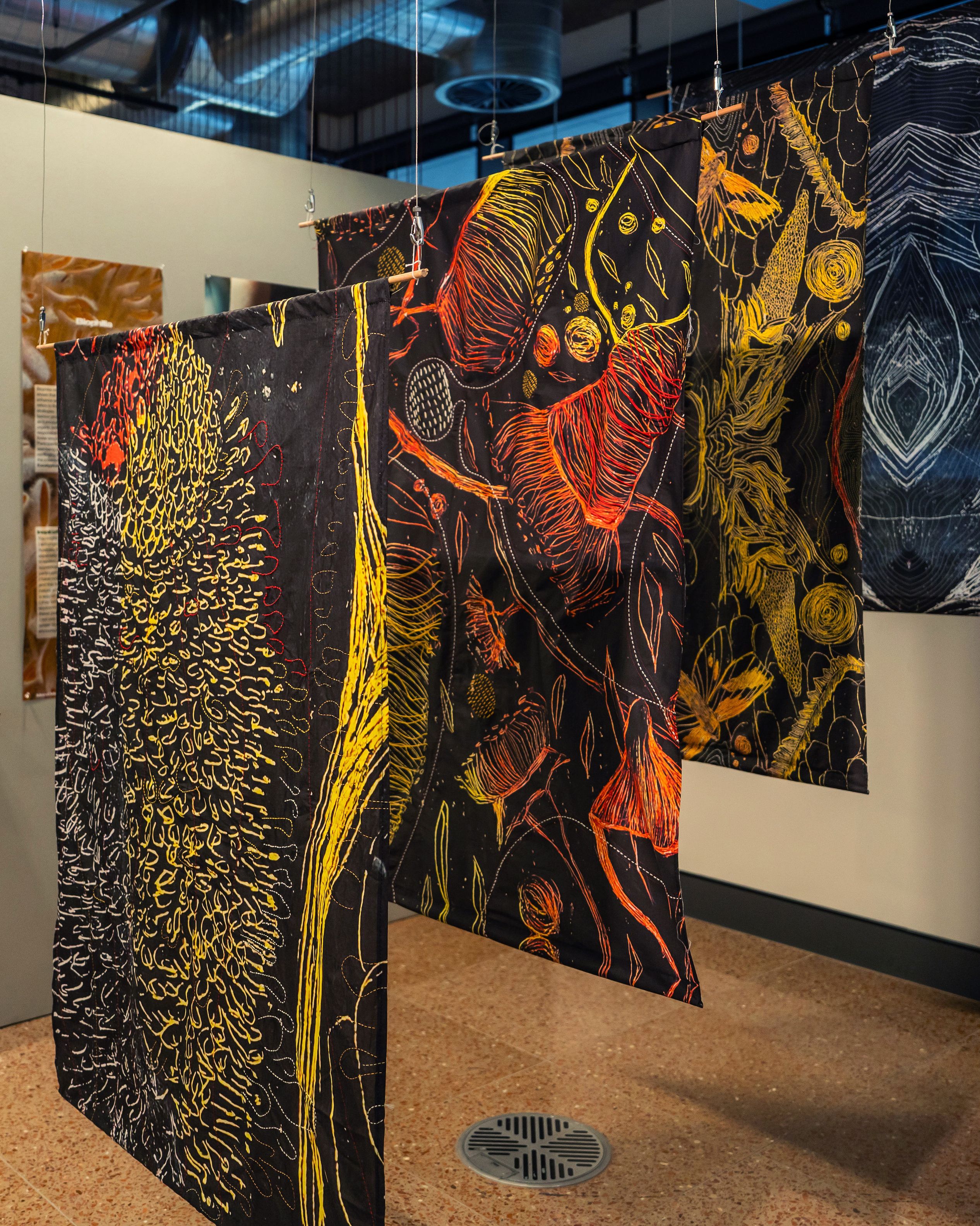These stunning textile works by Maral the founder of @maral.mahlouji were printed on a variety of different cottons and then sewn for exhibition and Maral embroidered over the top. I just love the end result. The huge scale and the close up of the native botanicals feels like a giant lino print.